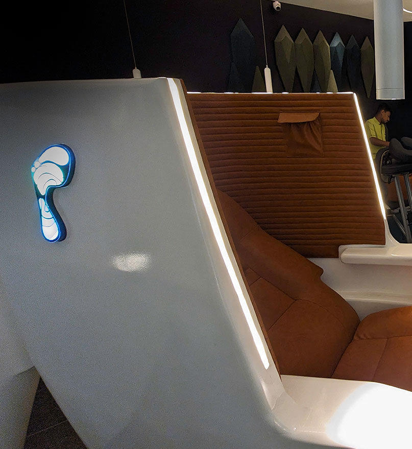 The spaces are differentiated from conventional spas by seating the customer in a luxurious pod which provides privacy and cocoons them from even other guests. A futuristic space is created that provides a sense of privacy and calm without evoking traditional ideas of the oriental spa.